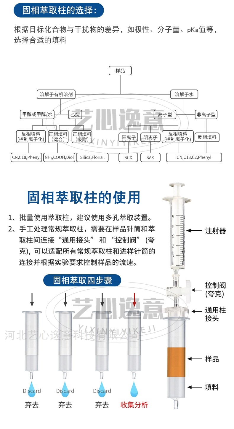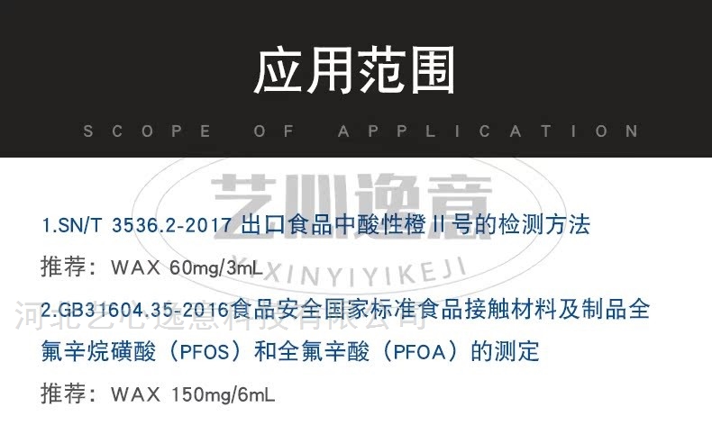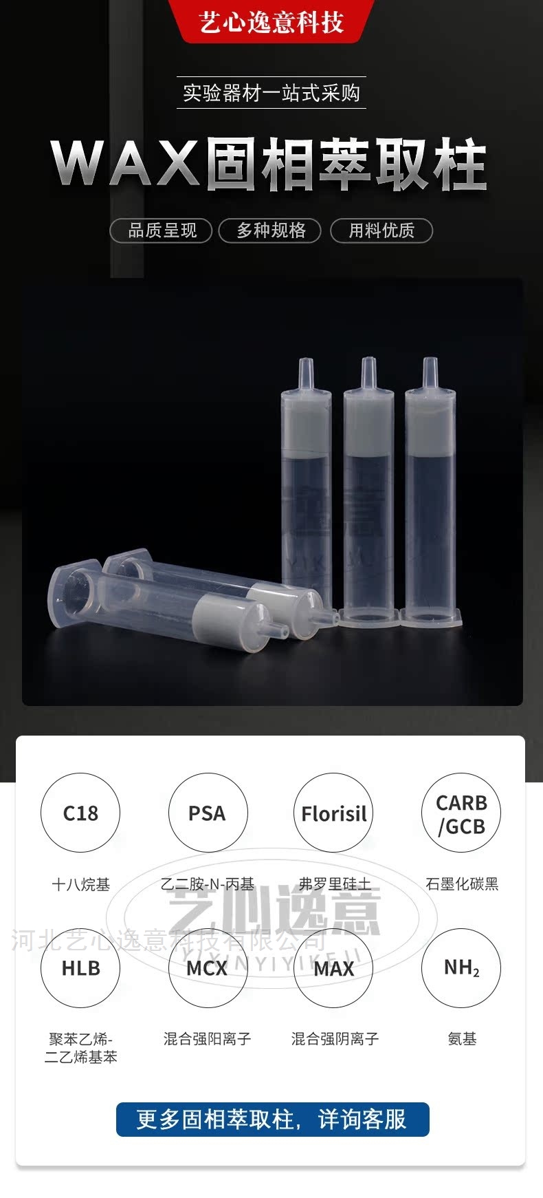 我公司产品种类多,规格齐全;容积:1ml,3ml,6ml,10ml,12ml,20ml;填料重量:60mg,100mg,150mg,200mg,500mg,1000mg,2000mg,5000mg;硅胶机制:C18,C18-U,C8,CN,PSA,NH2,SAX,SCX,Silica,PRS,PBA,PH;聚合物基质:HLB,WAX,WCX,MAX,MCX;吸附型类型:Florisil,ALA,ALN,ALB,Carb-GCB,Carb;混合型:C8/SAX,C8/SCX,Carb-GCB/HN2,Carb-GCB/PSA,Carb/SCX/PSA;专用柱:抗氧化剂检测专用柱,氯丙醇专用柱,茶叶专用柱,偶氮染料检测柱,皮革脱色专用柱,增塑剂检测柱,苯并芘专用柱,蜂蜜检测专用柱,PA聚酰胺检测柱,合成色素专用柱;离子色谱柱预处理柱:C18柱,RP柱,H柱,Ag柱,Na柱,Ag/H柱,Ag/Na柱
