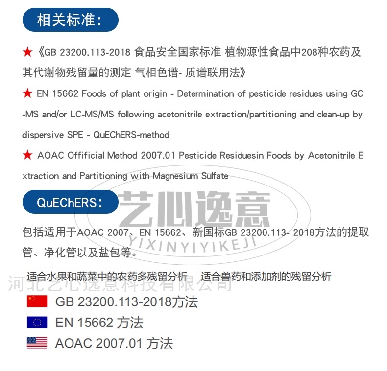 (3)适合AOAC 2007,EN 15662,GB23200.113等标准。